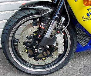 ![]() Achtkolben-Bremssättel & Gußbremsscheiben von Spiegler und Carbon Kotflügel |